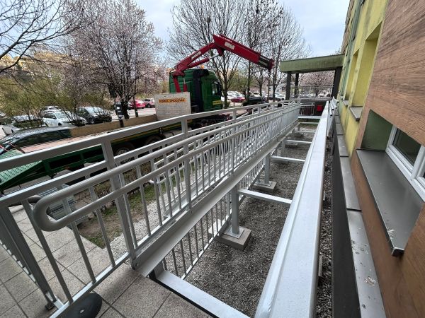 Wykonywana pochylnia poprawi dostępność wejścia do budynku, ułatwiając codzienne funkcjonowanie osobom korzystającym z wózków dziecięcych, osobom z ograniczeniami mobilności oraz seniorom.
